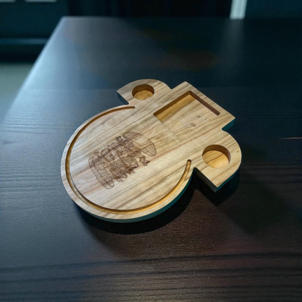 Gefertigt aus robustem Kirschholz, bietet das Brett eine großzügige Fläche für Burger, Beilagen und Saucen – alles durchdacht angeordnet für maximalen Komfort.